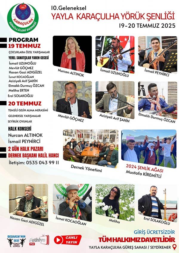Şenlik kapsamında, yerel ve yöresel özel yarışmalar ve seyirlik oyunların yanı sıra, 2 gün boyunca halk pazarı da kurulacak. İsmail Uzunoğlu, Mevlüt Göçmez, Hasan Gazi Adıgüzel, İsmet Kocaoğlan, Aziziyeli Arif Şahin, Elmalılı Durmuş Özcan, Meliha Erten ve Erol Solakoğlu yaylada yapılacak şenlikte sahne alacak. Ayrıca, Nurcan Altınok ve İsmail Peynirci’nin vereceği halk konseriyle şenlik coşkusu artacak. Karaçulha Gönüllüleri Derneği Başkanı yetkilileri tüm halkı bu ücretsiz etkinliğe davet etti.